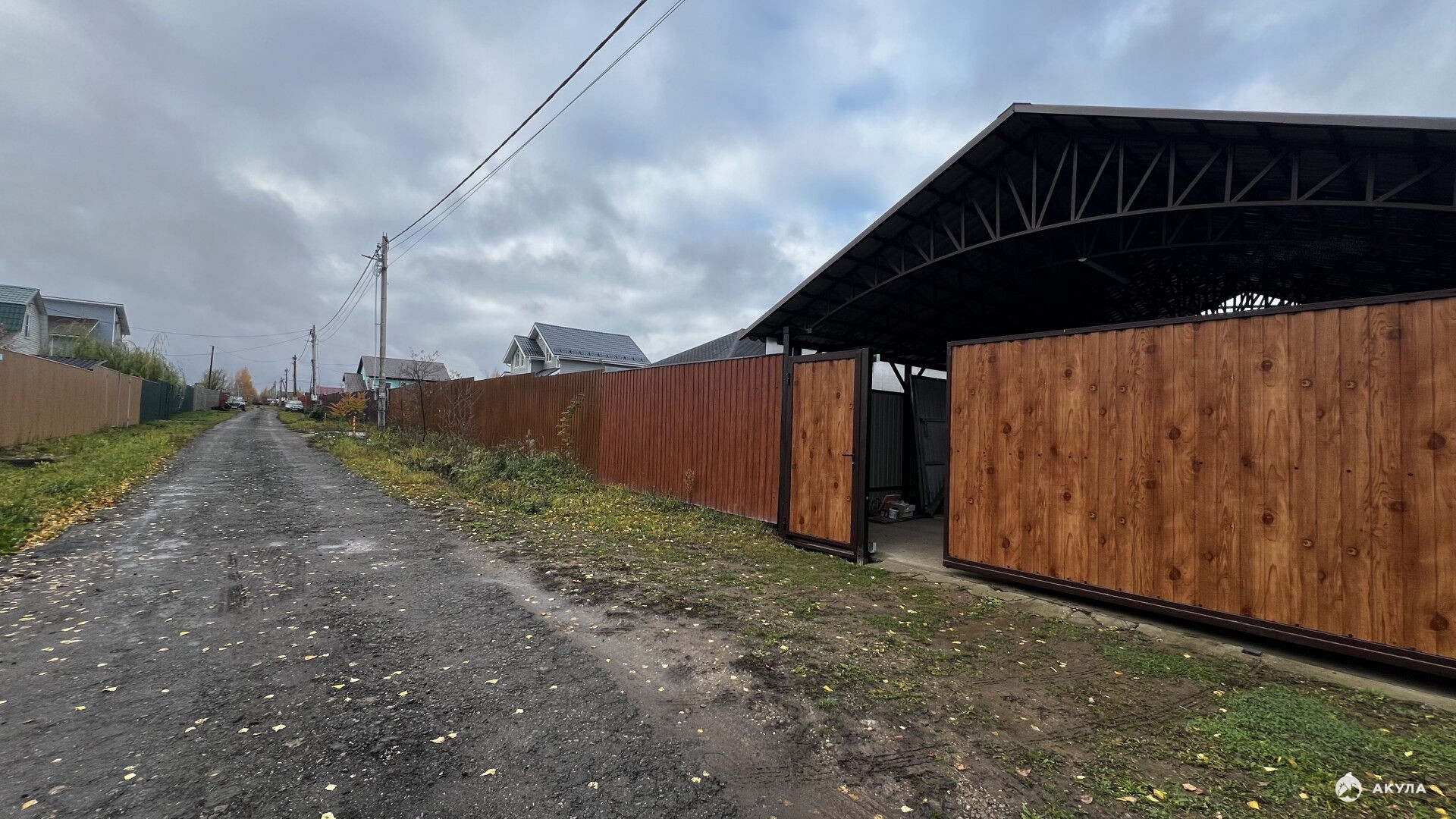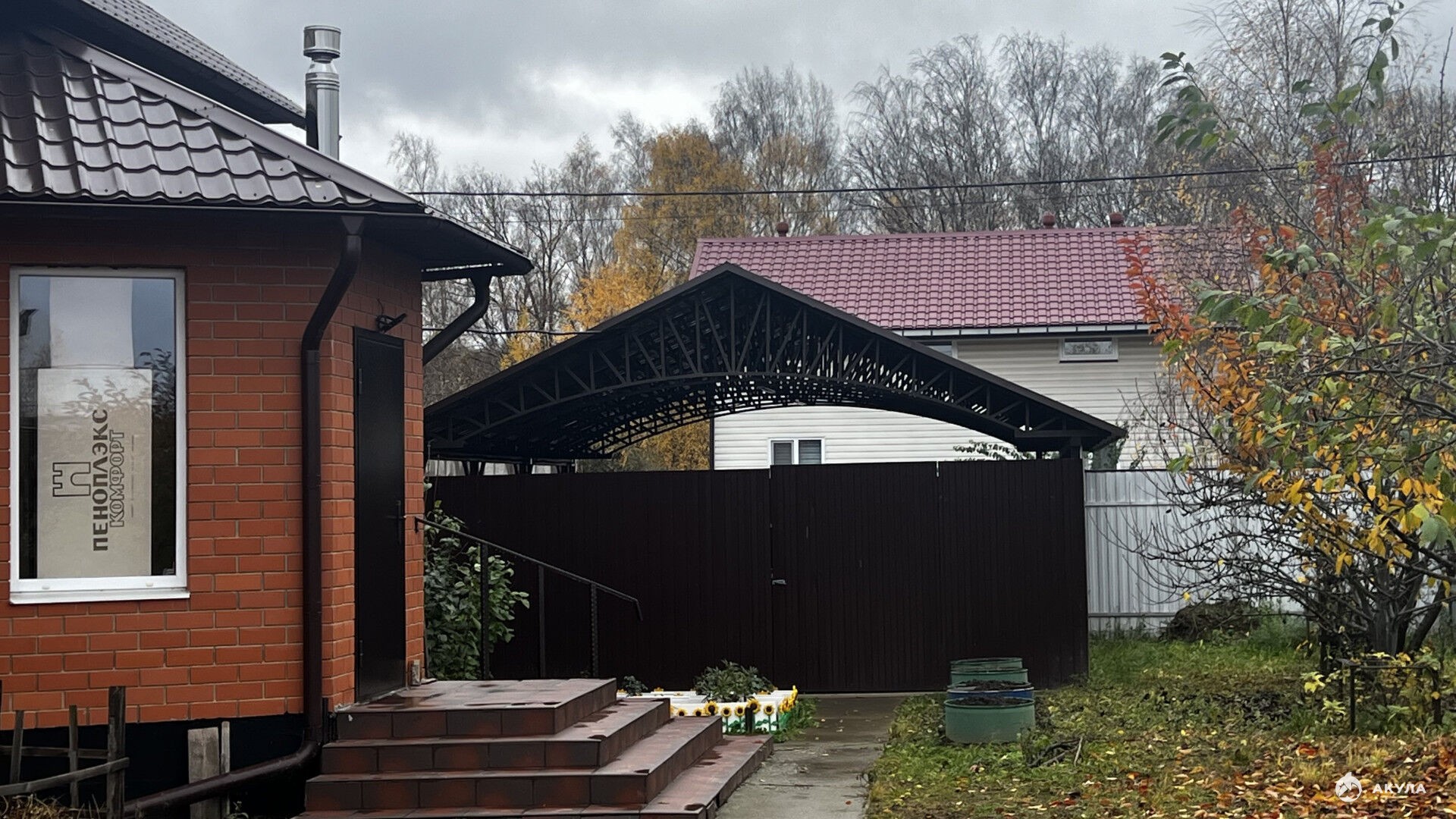 На участке основательный забор с откатными воротами, навес 6 на 8 с отдельно проведенным в него электричеством. Может вместить 3 автомобиля. Также на участке присутствует огромная теплица, хозяйственная постройка, которая вполне себе подойдет под баню. Дом 2015 года постройки(коробка), фундамент 2014.