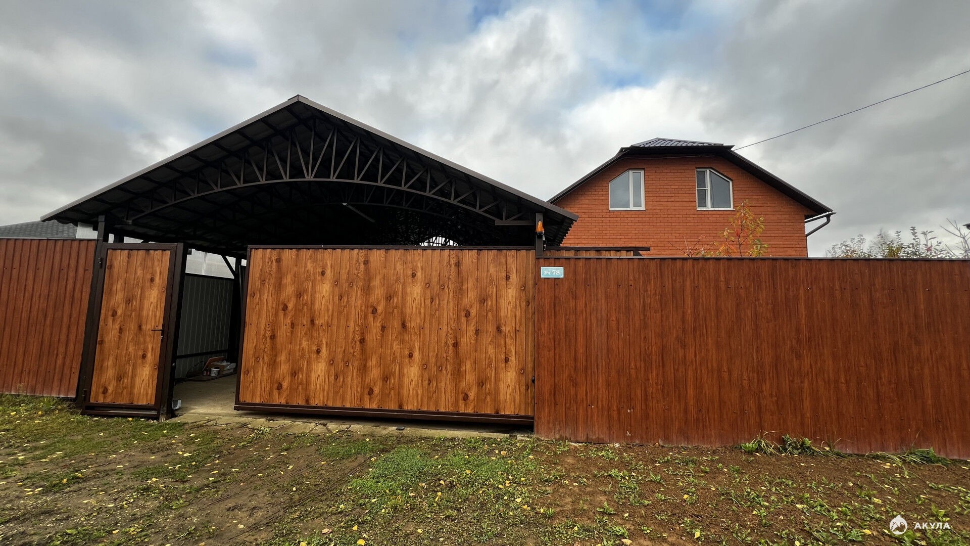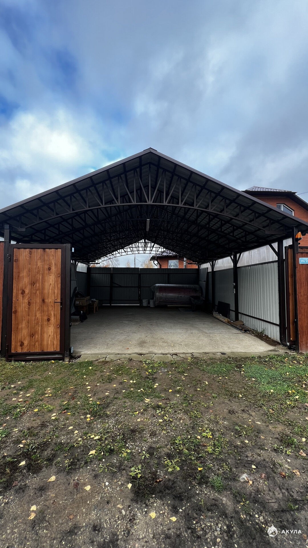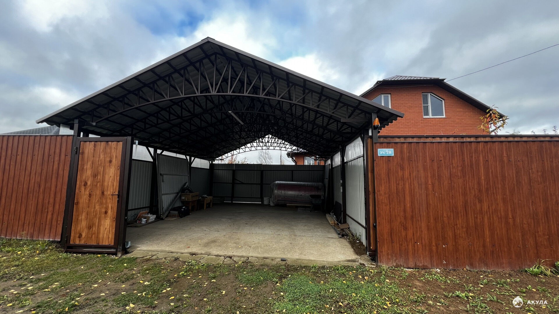 На участке основательный забор с откатными воротами, навес 6 на 8 с отдельно проведенным в него электричеством. Может вместить 3 автомобиля. Также на участке присутствует огромная теплица, хозяйственная постройка, которая вполне себе подойдет под баню. Дом 2015 года постройки(коробка), фундамент 2014.